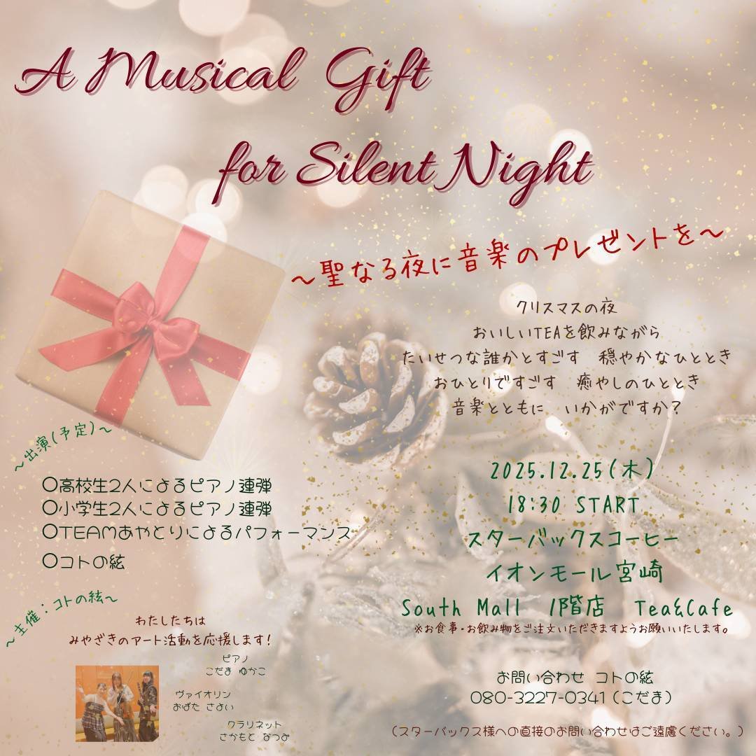 12月25日(木)18:30~、スターバックスコーヒー イオンモール宮崎(South Mall 1階店Tea & Café)にて開催の「A Musical Gift for Silent Night」に出演しました😊